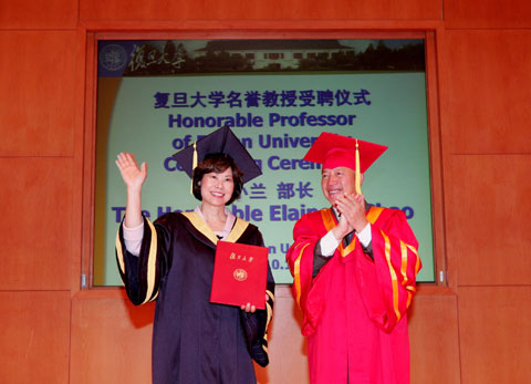 新闻中心讯 2009年10月14日,美国首位华裔女性内阁部长、前劳工部长赵小兰女士访问我校,并正式受聘为我校大学名誉教授。校党委书记秦绍德出席了当天的授证仪式向赵小兰女士授予复旦大学名誉教授聘书。在授证仪式上,赵小兰女士向600多位复旦师生发表了题为“中国心 美国情 世界和谐”的演讲。陪同赵女士共同访问我校的还有其父,曾于去年访问我校的赵锡成博士等人。