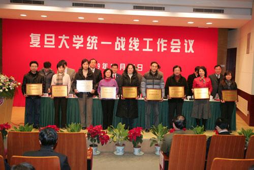 在会上,校党委表彰了复旦大学统一战线、统战工作的先进集体和个人。中山医院党委副书记牛伟新,民建会员、高分子系教授江明院士,生命科学学院分党委书记叶敬仲,无党派人士、公共卫生学院副院长钱序代表先进集体和个人发言。