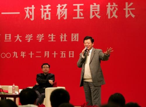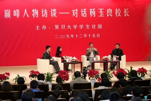 新闻中心讯 2009年12月15日晚,光华楼吴文政报告厅座无虚席。应学生社团的邀请,校长杨玉良在这里与本科生进行了长达两个半小时的“亲密接触”,就复旦精神、复旦优劣势、复旦教学与科研等话题与在场学生进行了广泛交流。经济学院陆铭教授作为访谈嘉宾参加了讲座。