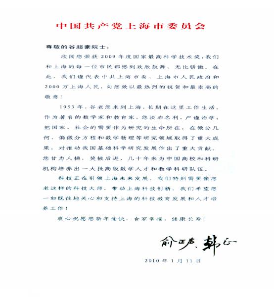 新闻中心讯 2010年1月12日,中共中央政治局委员、市委书记俞正声,市委副书记、市长韩正代表上海市委市府发来贺信,祝贺谷超豪教授荣获国家最高科学技术奖。