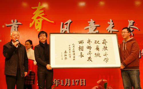 秦绍德书记在会议上发表讲话,充分肯定了“人才工程”预备队取得的成绩,强调学校要继续加大投入,坚定不移地建设这支队伍。学生工作部门也要适应新形势,完善体制机制。秦书记还亲笔题词“亦教亦学双肩挑,亦师亦友两相长”,勉励“人才工程”预备队队员认真对待辅导员这份事业,争取成为让学生一生难忘的老师。队员们向秦书记回赠了全体与会队员签名的海报和纪念杯表达感谢。