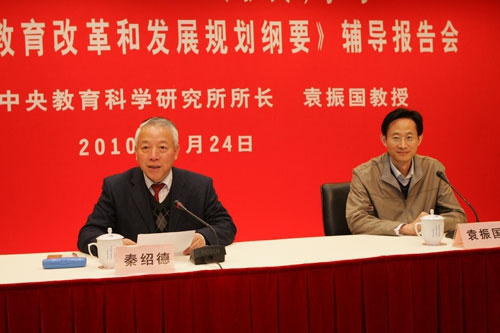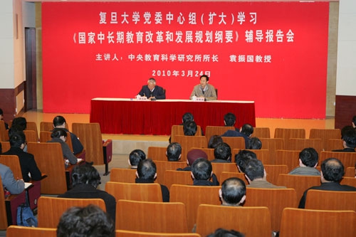 3月24日,校党委中心组举行扩大学习会,邀请中央教育科学研究所所长、全国教育科学规划领导小组办公室主任袁振国教授作关于《国家中长期教育改革和发展规划纲要》辅导报告。校党政领导、各单位负责同志及部分师生代表近200人参加学习会。校党委书记秦绍德主持会议。