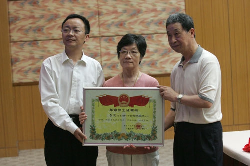 座谈会上,桂永浩副校长为《复旦英烈传》新书首发揭幕。校党委办公室主任周亚代表学校向烈士家属宋少杰、陈小炎、于化芬等以及学生代表赠书,表达了学校对烈士的缅怀之情。同时,吕俊烈士的父母向学校捐赠了《吕俊烈士证》,档案馆将永久保存这份珍贵的纪念。校档案馆馆长周桂发也代表学校向吕俊的父母颁发了捐赠证书。