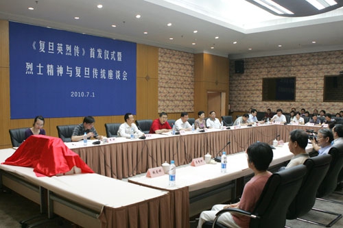 新闻中心讯 在中国共产党建党89周年之际,复旦大学党委宣传部、档案馆和出版社联合举行了“《复旦英烈传》首发仪式暨烈士精神与复旦传统座谈会”。校党委书记秦绍德在会前亲切接见了与会的复旦烈士的家属。副校长桂永浩到会并讲话。部分复旦烈士家属,“全国优秀教师”、“全国高校优秀思想政治理论课教师”等荣誉称号的获奖者、复旦历史系82级校友、上海大学李梁教授,以及校内有关部门负责同志参加座谈会。座谈会由校党委宣传部部长萧思健主持。