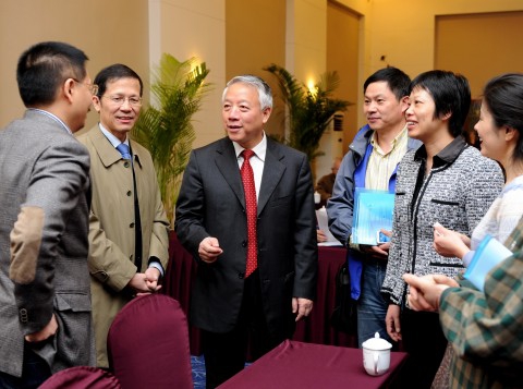 (蒋巨峰省长(左一)与秦绍德书记、李光宪会长(右一)合影)