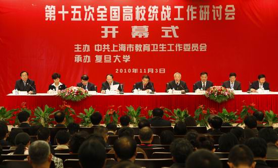 新闻中心讯 2010年11月3日,第十五次全国高校统战工作研讨会在复旦大学召开。中共上海市委常委、统战部部长杨晓渡、中央统战部六局局长王永庆出席开幕式并作重要讲话,国家教育部思想政治工作司司长杨振斌为研讨会作了《进一步提高高等学校统战工作科学化水平》主题报告,上海市教卫工作党委书记李宣海、复旦大学党委书记秦绍德在开幕式上致辞。来自全国各省(市区)党委统战部门、教育工作部门以及各地170所高校的250多位代表,围绕提高高校统战工作科学化水平开展了深入的研讨。上海市委统战部、上海市教卫工作党委有关负责同志出席了会议,中国统一战线理论研究会统战基础理论上海研究基地的专家为与会同志作了专题报告。