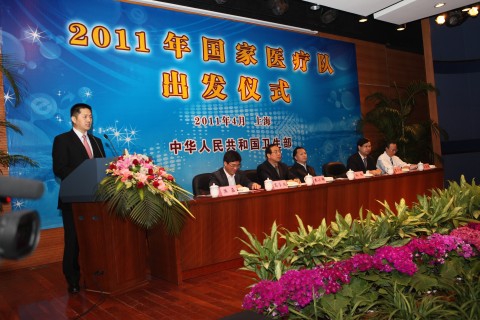 当日上午,卫生部在复旦大学附属中山医院举行简朴而热烈的“2011年国家医疗队出发仪式”,由卫生部有关领导向三家医院代表和国家医疗队云南分队代表授旗,标志着“国家医疗队”巡回医疗项目正式启动。
