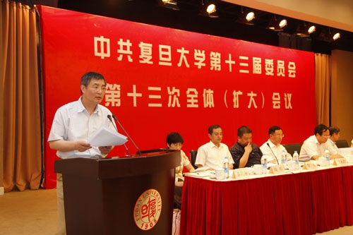 新闻中心讯 7月14至15日,中共复旦大学第十三届委员会第十三次全体(扩大)会议在光华楼举行。会议的主题是:学习贯彻胡锦涛总书记在庆祝中国共产党成立90周年大会上的重要讲话精神,贯彻落实《国家中长期教育改革和发展规划纲要》提出的各项任务,以提高人才培养质量和科学研究水平为主线,以建立有中国特色的社会主义现代大学制度为目标,深化改革,加快发展,使我校的综合实力在“十二五”期间迈上新台阶。校党委常委会主持会议。党委书记秦绍德,党委常委、校长杨玉良分别在会上作了重要讲话。