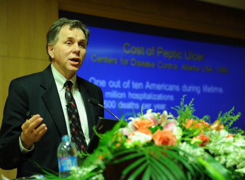 新闻中心讯 9月21日下午,阿斯利康诺贝尔医学项目中国巡讲在枫林校区明道楼一楼报告厅座无虚席,到处站满了听众,凡能容身之处均被挤得水泄不通,“诺贝尔奖之路-向幽门螺杆菌的发现者寻找启示”学术讲座在这里拉开帷幕,2005年诺贝尔生理或医学奖得主巴里•马歇尔教授生动幽默的演讲,受到超乎寻常的热烈欢迎。