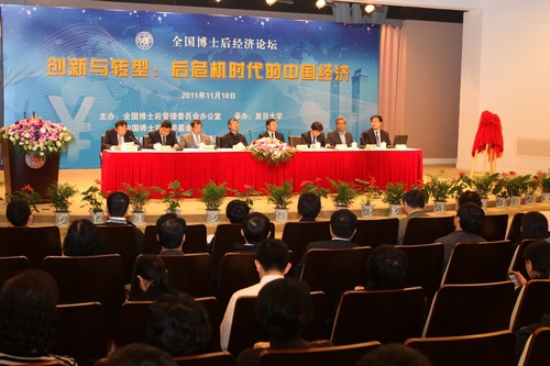 新闻中心讯 11月18日,“创新与转型:后危机时代的中国经济”全国博士后经济论坛在我校举行。中国博士后科学基金会秘书长夏文峰、上海人力资源与社会保障局副局长毛大立、复旦大学常务副校长陈晓漫、全国高校博士后研究会会长范德尚出席论坛开幕式并致辞。来自全国多所知名高校及科研院所的专家学者及博士后代表近四百人参会。开幕式由中国博士后科学基金会基金处处长刘连军主持。