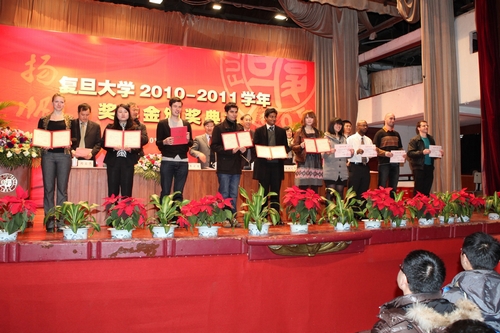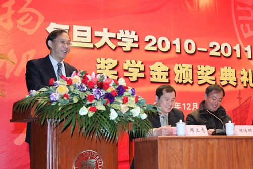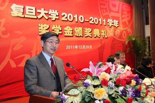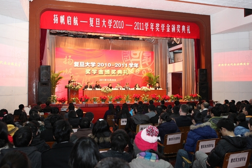 一段记录了部分本学年获奖学生剪影的视频拉开了颁奖典礼的序幕,展示了他们一学年来出众的学习工作成果。各领导在会上宣读了2010-2011学年本(专)科生、研究生、外国留学生奖学金获奖名单,并为获奖者代表颁奖。典礼由党委研究生工作部部长周立志主持,党委学工部部长许玫作了《复旦大学2010-2011学年奖学金评审工作报告》。