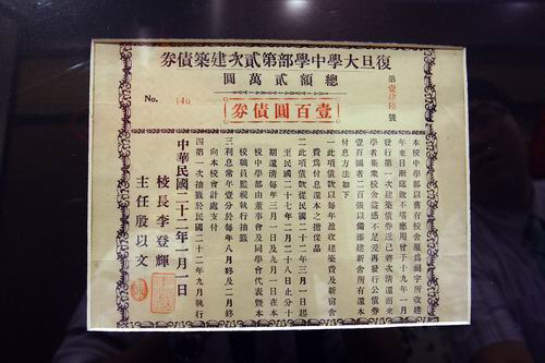 当天的展览开幕式上,全国收藏家协会会员、金融票证收藏者汪志刚先生还代表协会正式向复旦大学赠送了两件礼物。其中一件对复旦大学来说意义非凡,那是1933年复旦大学中学部为了在国家内忧外患的情况下坚持办学第二次发行的建设债券——这件票证文物,是复旦人创业时期,艰苦兴学、筚路蓝缕的缩影和见证。而另一件票证是光绪三十四年大清政府发行的津浦铁路债券,该票证也具有极高的历史价值和政治意义。林尚立副校长向汪志刚先生颁发了捐赠证书。