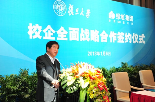 新闻中心讯 1月6日,我校与绿地集团签署全面战略合作协议。上海市人大常委会副主任胡延照、校党委书记朱之文出席仪式并致辞。校长杨玉良与绿地集团董事长、总裁张玉良代表双方签署校企全面战略合作协议。常务副校长陈晓漫与绿地集团副总裁许敬代表双方签署管理学院新院区项目建设协议。副校长冯晓源等出席签约仪式。