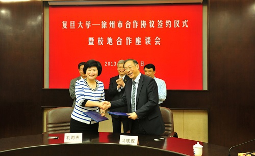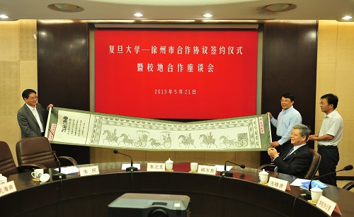21日上午,复旦大学—徐州市合作协议签约仪式暨校地合作座谈会在逸夫楼圆桌会议室隆重举行。校党委书记朱之文、校长杨玉良出席仪式。朱之文与朱民代表校地双方互赠纪念品。校长杨玉良在签约仪式上致辞。他表示,作为大学的功能之一,服务社会、服务长三角是复旦大学重要的社会责任和使命。学校在科技成果转化、人才培养、干部交流、医疗合作等领域与徐州市有着广泛的合作前景,要通过对接具体需求、制定具体方案、解决具体问题,将此次校地合作抓好抓实,力争结出硕果。