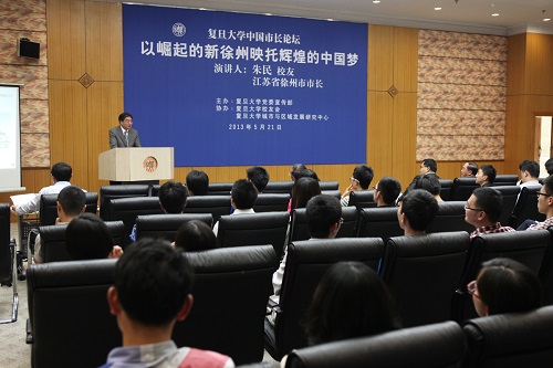 新闻中心讯 5月21日,时值校庆108周年之际,我校84届经济学院校友、江苏省徐州市委副书记、市长朱民回到母校,率团与母校签署合作协议,并登台复旦大学中国市长论坛,为师生们带来一场题为“以崛起的新徐州映托辉煌的中国梦”的精彩演讲。这是复旦大学建校108周年系列庆典活动中的一项重要活动,也是校友回馈母校,为母校诞辰带来的一份重要献礼。