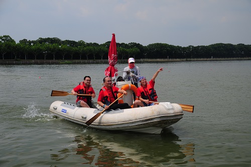 8月30日,在一个简短的模拟出征仪式后,全体参训的救援队员即刻开拔!他们携带辎重开始了距离9公里的拉练——顶着烈日,沿途历经数次“灾民群众”的考验,终于在正午12时抵达了演习预定地点。然而,一条150米宽的河流却横亘在面前……队员们想方设法联系船只,协调野战医院的搭设地点,并在同舟共济中抵达了野战医院预设的营地。