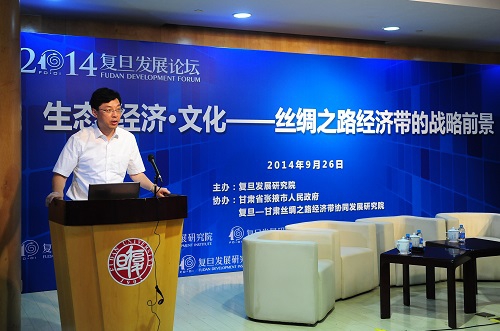 9月26日,由复旦发展研究院主办、中共张掖市委、复旦—甘肃丝绸之路经济带协同发展研究院协办的“2014复旦发展论坛”举行。本次论坛主题为“生态•经济•文化——丝绸之路经济带的战略前景”。甘肃省张掖市委书记陈克恭、外交部亚洲司副司长杨健、复旦大学生物多样性研究所陈家宽、复旦大学历史地理研究所教授侯杨方等嘉宾受邀参会。复旦大学党委副书记、复旦发展研究院副院长刘承功在论坛上致辞。