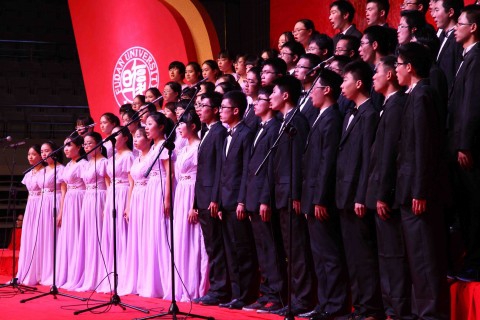 在院系精彩献唱的同时,团学干部校友合唱团和校合唱团也为我们带来了精彩的曲目。团学干部校友合唱团是由曾经在复旦工作过的团干部组成的。他们的歌声尽管不再清脆,但对复旦的爱却更加深沉。他们演唱的《在太行山上》和《让世界充满爱》感染了在场所有的师生,歌声久久回荡在正大上空。校合唱队则用专业和热情的表演征服了全场观众。