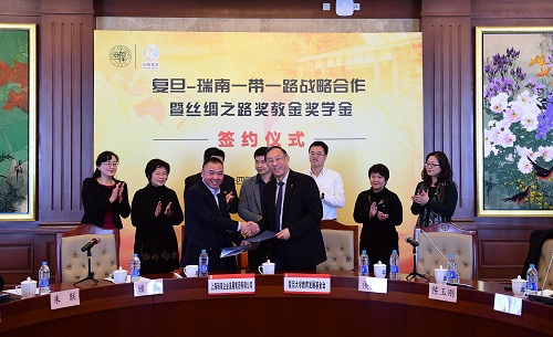 12月23日上午,复旦-瑞南一带一路战略合作暨丝绸之路奖教金奖学金签约仪式在复旦大学光华楼思源报告厅隆重举行。复旦大学常务副校长陈晓漫会见了上海瑞南企业发展集团有限公司一行。上海瑞南企业发展集团有限公司董事长庄友才、副总裁顾黎、副总裁朱联,复旦大学副校长、复旦大学教育发展基金会法定代表人冯晓源、复旦-甘肃丝绸之路经济带协同发展研究院院长侯杨方等出席了签约仪式。