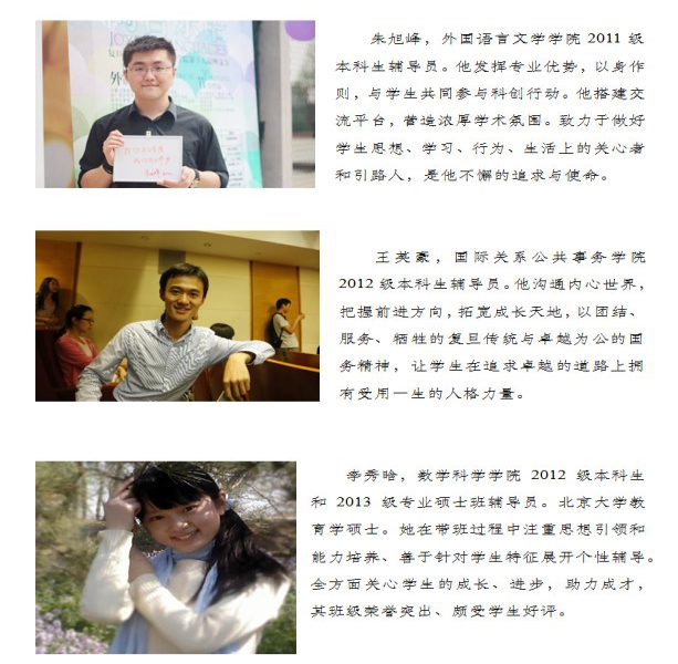 辅导员是帮助大学生健康成长的人生导师和知心朋友,也是学校宝贵的人才资源。复旦大学历来高度重视辅导员队伍建设,连续十一年举办“复旦大学本(专)科生十佳辅导员”评选活动,选树表彰了一批政治素质过硬、工作作风优良、深受学生爱戴的优秀辅导员,促进了队伍的交流和工作质量的提升,成为学校学生工作队伍建设的重要品牌。