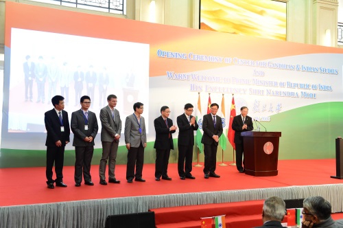 在甘地和印度研究中心揭牌仪式上,主持人冯晓源副校长介绍了该中心的负责人和研究人员,两名复旦学生用梵文朗诵印度史诗《摩诃婆罗多》。随后,许宁生校长在致辞中对莫迪总统一行到访表示热烈欢迎。他指出,复旦大学在中印两国人文交流中起到了积极促进作用,复旦有关印度的研究与合作可以追溯到上个世纪,而目前正在进行的丝绸之路、西域、玄奘取经之路等的综合研究与印度密切相关。许宁生表示,学校将整合资源,与ICCR等机构、高校密切合作,力争把中心建设成国内研究印度历史、社会、经济、文化和甘地思想的重要基地和交流平台,期望通过学术科研活动,推进两国相互了解共同合作。