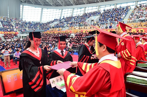 在庄严而神圣的学位授予仪式环节,博士毕业生在全体与会师生和家长的见证下依次从颁证主席手中接过学位证,接受拨穗,为自己过去几年的研究生学习画上了圆满的句号。最后,毕业典礼在全场师生深情的校歌声中落下了帷幕。