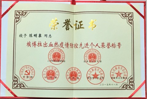 陈明泉是我国援助塞拉利昂防控埃博拉出血热第三批公共卫生师资培训队专家,今年1月21日离沪抵京,在中国疾控中心接受严格的行前集训,领受任务后,1月27日上午从北京出发,到达塞拉利昂首都弗里敦(Freetown),会同第二批公共卫生师资培训队完成师资培训的收尾工作,并负责继续推进3个行政村的重点培训工作,全面开展包括病例调查、密切追踪和管理、社区动员与宣传、常见传染病监测与诊治等工作,还担任队员的保健医生,制定队员在塞时的疟疾防控措施。在圆满完成为期2个月的埃博拉疫情防控救治任务并经过3周的医学观察后,于4月21日返沪。此次上海共有2位医务人员获得表彰,另一位是上海疾控中心传染病防治所的吴寰宇主任医师。