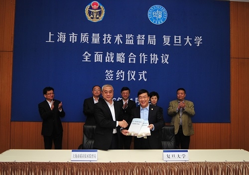 新闻中心讯 11月3日上午,我校与上海市质量技术监督局在逸夫科技楼多功能厅举行全面战略合作协议签约仪式。上海市副市长陈寅、校党委书记焦扬出席仪式并讲话。校长许宁生与市质监局局长黄小路代表双方签署全面战略合作协议。市政府副秘书长孙继伟主持会议,市质监局副局长陶永华介绍双方全面战略合作背景,市质监局总工程师陆敏、副校长金力出席签约仪式。