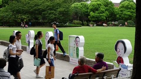 复旦五位老校长卡通形象的创意合影区成为迎新日的一处景观。