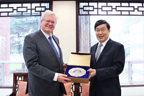 10月11日上午,澳大利亚国立大学校长、诺贝尔物理奖得主布莱恩·施密特(Brian P. Schmidt)访问复旦大学,并以“加速膨胀的宇宙”为主题为复旦师生带来专题报告会。报告会前,中国科学院院士、复旦大学校长许宁生会见了布莱恩·施密特,双方就各自学校的学科发展规划、主要发展目标等进行了交流,并希望在新工科项目、基础医学研究、当代中国研究、大洋洲研究等方面加强合作。