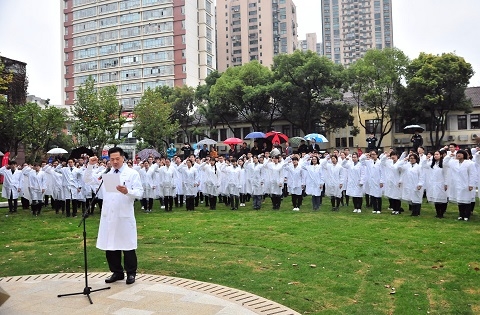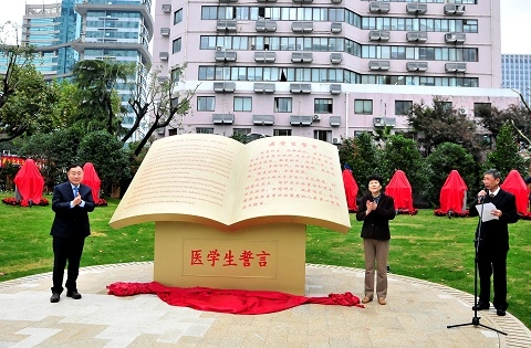 医学生誓言由来已久,自从古希腊希波克拉底誓言面世以来,庄严宣誓就成为医学生从业的一个重要仪式。医学生誓言不仅是每个医学生的习医行为规范,更是每个医学生对医学事业的一份责任和承诺。上医此前就设有医学生誓言碑,此次揭幕的誓言碑为重建,面对誓言碑宣誓已成为了上医每届新生的“入学第一课”。