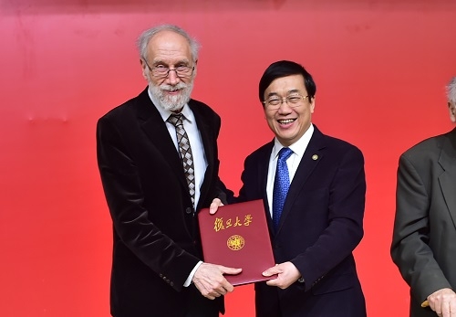 报告会前,中国科学院院士、复旦大学校长许宁生为迈克尔·阿蒂亚和阿兰·孔耐颁发复旦大学荣誉教授聘书。受聘仪式由中国科学院院士、复旦大学常务副校长包信和主持,公众报告由上海市数学会理事长陈晓漫教授主持。