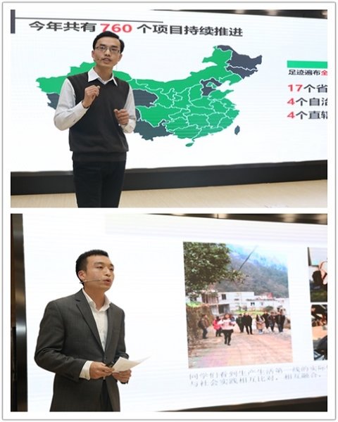 2018年寒假社会实践优秀项目代表先后分享了社会实践中的精彩故事和成长感悟。作为将持续三年的社会实践项目,哲学学院2017级博士生田博毅以双鸭山市驻村第一书记工作和饶河县小南河村党建带脱贫的成功经验,初步分析基层党建在精准脱贫和乡村振兴战略布局中的连接作用与机制;材料科学系的左宗正对福建屏南的“脱贫攻坚、精准扶贫”进行了考察,通过分析实践里的“那村、那人、那事”,深入学习、探讨以基金会为代表的社会力量在扶贫工作中的重要作用;新闻学院2017级硕士研究生李相如向大家讲述了寒假参访中国航天员中心的经历,展现改革开放四十年来,一群群中国航天人对于中国航天事业坚持不懈筑梦、逐梦、圆梦的生动身影;基础医学院本科生王婧以“认识分娩镇痛,共促健康中国”为题,回归生命本源,关怀女性心理,引导公众对“分娩镇痛”的关注和认知;博士生讲师团讲师王翩秉承“学以致用双向增进,宣传理论服务社会”的宗旨,致力于“深入基层讲理论,弘扬时代主旋律”,积极思考如何把党的最新思想最新理论带到最需要的地方;核科学与技术系的石盼华和国际关系与公共事务学院的孙钰欣把目光投向了自己的家乡,进行了深入的体悟与考察,致力于用创意改变家乡,演绎了一幕“最爱的家乡,我从未远离”的精彩故事。