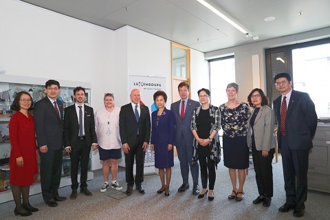 揭牌仪式前,焦扬一行参观了卢森堡大学的系统生物医学中心(LCSB),该中心的精准医疗,尤其在帕金森病方面的个性化医疗研究令人印象深刻。焦扬盛情邀请LCSB的研究人员访问复旦,与复旦大学在医学研究领域建立合作。揭牌仪式后,焦扬和Pallage就两校在未来多个领域上进一步合作的可能性进行了充分的沟通与探讨。