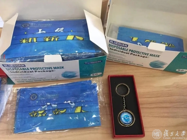 大气与海洋科学系准备了带有院系元素的钥匙环和口罩,佩戴上蔚蓝的口罩,一眼就能在人群中分辨出该院系的新生。