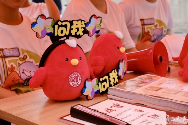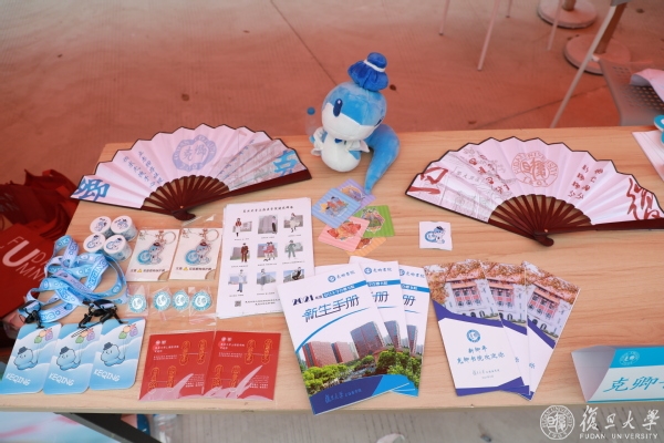 书院手册、笔记本、书签、扇子、书信套装、文件夹、卡套、挂钩……书院学生自主设计主题文创内容,以书院五彩标志色和老校长为元素制作实物产品,汇集成“书院大礼包”,美观性与实用性兼具,倾注着学长学姐们的用心,希望帮助新生尽快熟悉复旦文化,融入校园生活。由学生绘制的老校长卡通形象也在当天亮相,成为新生们纷纷合影的对象。