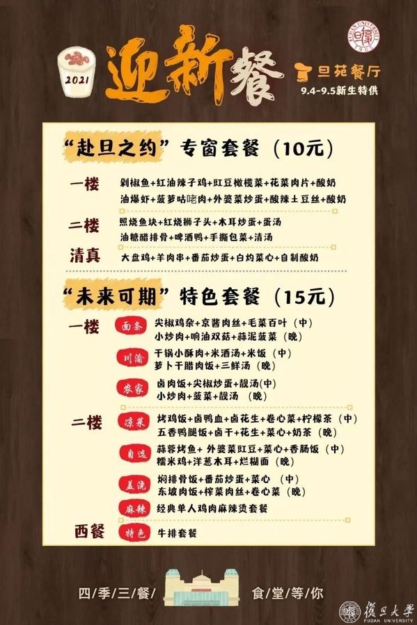 学校食堂特别准备“赴旦之约”“未来可期”新生专属套餐,种类丰富、口味多样、美味实惠,寄寓了对新生在复旦学习生活的美好祝福。另外,新生打卡迎新餐还可参加互动,留言心动菜品、凭新生餐光盘抽奖,现场答题可领取奖品,用温馨互动教育学生的同时让新生尽快熟悉食堂、融入校园,乐享学习,安享生活。