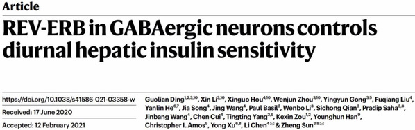 北京时间3月25日凌晨,《自然》(Nature)杂志在线发表了题为“REV-ERB in GABAergic neurons controls diurnal hepatic insulin sensitivity” 的研究论文。该研究由复旦大学附属妇产科医院/生殖与发育研究院丁国莲课题组与美国贝勒医学院孙正课题组以及山东大学齐鲁医院陈丽课题组等合作完成。