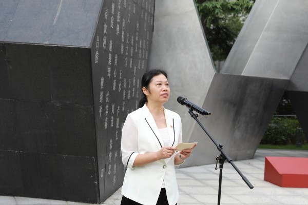 焦扬、许宁生等校领导缓步来到纪念雕像前,驻足凝视,代表全校师生整理花篮缎带。理毕,退后三步,带领在场全体师生向烈士雕塑行三鞠躬礼。随后,在焦扬、许宁生的带领下,烈士家属代表、老师、同学整齐列队缓步上前敬献鲜花。