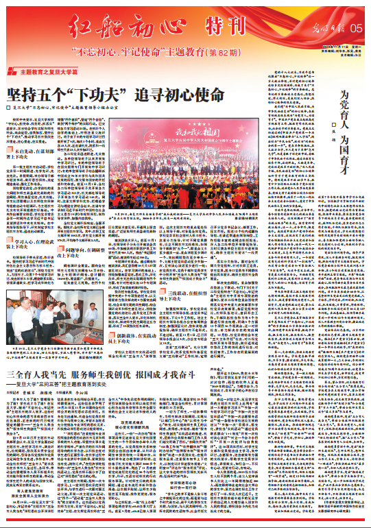 教书育人为了谁?管理服务为了谁?学生成才为了谁?在复旦大学,随着“不忘初心、牢记使命”主题教育的深入展开,这份对初心和使命的思考承载着百余年红色基因,正在新的时代召唤更坚定的回答——“三全育人我当先”“服务师生我创优”“报国成才我奋斗”。