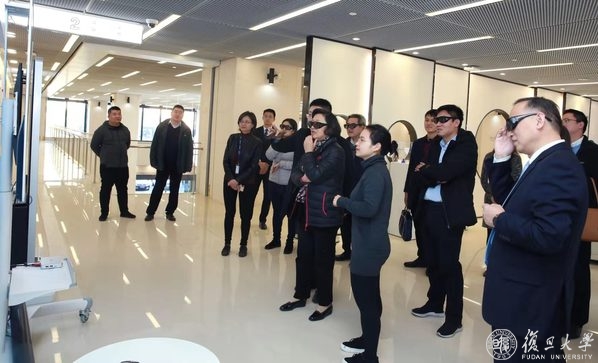 下午,指导组一行来到枫林校区。在复旦大学党委副书记、纪委书记、上海医学院党委书记袁正宏陪同下,指导组一行来到位于图书馆五楼的上医人文库,重点参观了上海医学院一级教授、院士的论文手稿、丰厚的著述和其它捐赠品,包括上医创始人颜福庆教授使用过的打字机等。在二楼新技术体验区,指导组一行观看了医学学科馆员演示VR桡骨内固定术和AR心脏模型,并且戴上3D眼镜观看了胃癌根治术片段。