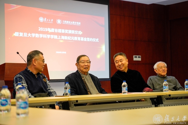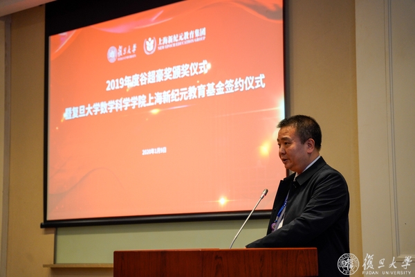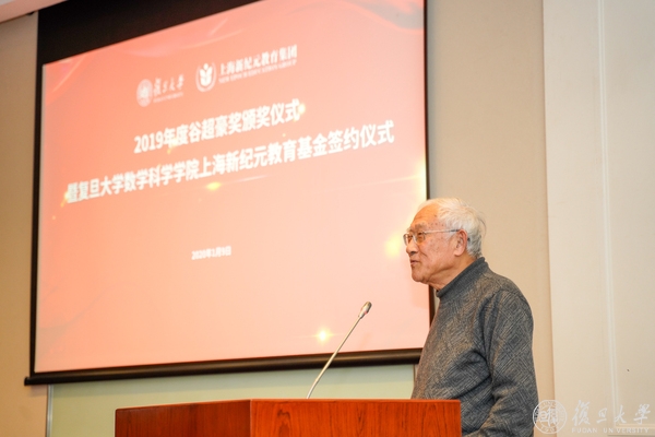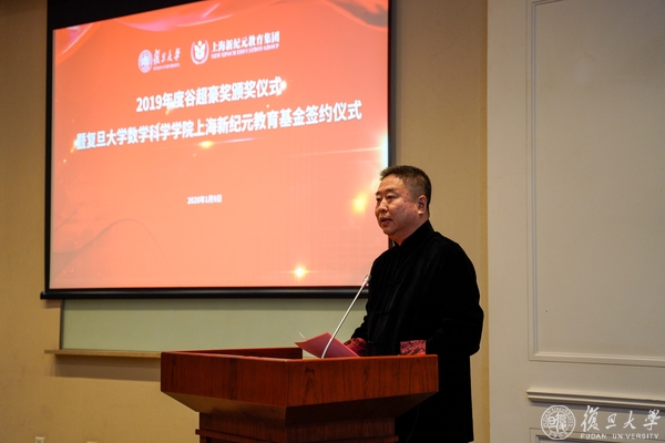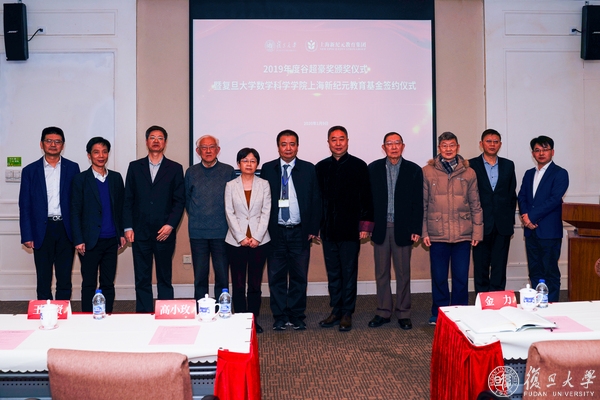 1月9日下午,2019年度谷超豪奖颁奖仪式暨“复旦大学数学科学学院上海新纪元教育基金”签约仪式在光华楼东辅楼101室举行。全国政协常委、民革中央副主席、上海市人大常委会副主任、民革上海市委主委高小玫,民革中央委员、民革上海市委会副主委、全国政协委员、上海市政协常委王光贤,复旦大学常务副校长、中国科学院院士金力,中国科学院院士李大潜、洪家兴、陈恕行,上海新纪元教育集团董事长陈伟志,浙江省人民政府驻上海办事处副主任章春华,温州市政府驻上海联络处徐珅隆,历届“谷超豪奖”获奖者,复旦大学对外联络与发展处负责同志,数学科学学院党政领导班子成员、教师及学生代表出席参加活动。