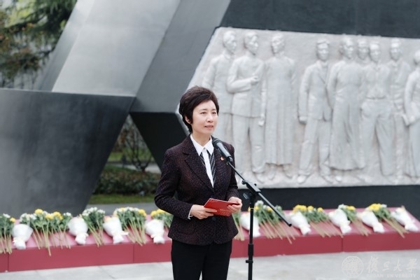 刚才,在听取师生代表深情朗诵时,我们的灵魂被震撼,我们的热血在沸腾。我们深切缅怀先烈、传承红色基因,汲取开拓前行的力量、勇气和智慧。今天的活动,也是学校庆祝建党百年、开展党史学习教育的重要内容。我谨代表复旦大学全体师生员工,向为国捐躯的英雄先烈和今天来到现场的英烈家属致以崇高的敬意!同时也向对雕塑及广场落成做出重要贡献的复星公益基金会、上海美术设计公司表示衷心的感谢!