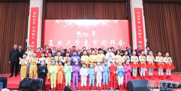 团拜会上,一个个精彩的文艺节目把气氛带向高潮。复旦二附校20多位可爱的孩子带来集体舞《元日》,欢快的舞蹈表达了孩子们对迈入新时代、走进新校园的无比喜悦;数学科学学院教授林伟、物理学系教授吴施伟、化学系教授李巧伟、先进材料实验室副研究员彭瑞等四位青年科学家带来诗朗诵《未来请看我》,表达复旦人用一腔赤子之心报效祖国,立足岗位建功立业的豪情;复旦的血脉,传承着红色的基因,复旦的师生,弘扬着优秀传统文化,档案馆退休教师高晓虹带来京剧《红灯记》选段《都有一颗红亮的心》,计算机科学技术学院辅导员王秦带来京剧《打龙袍》选段《见皇儿跪埃尘》;万水千山不忘来时路,斗转星移牢记肩上担,工会合唱团带来压轴歌曲《不忘初心》,团拜会在全场合唱《复旦大学校歌》中结束。