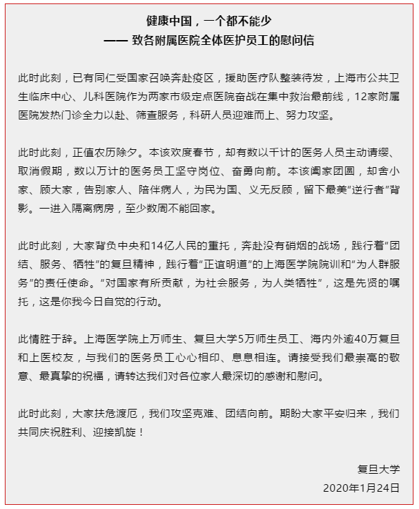 值此新春佳节之际,复旦大学向奋战在抗击疫情一线的广大医护人员表达慰问和致敬!我们等你们平安归来!