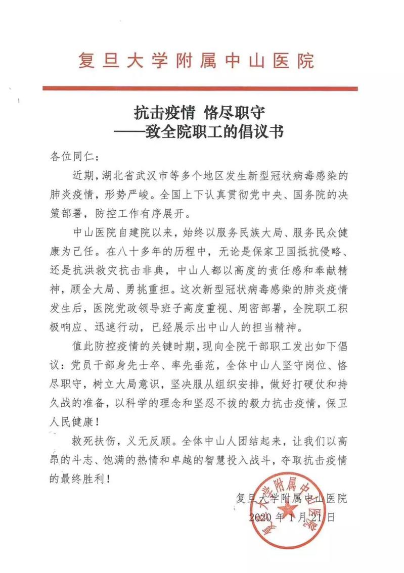 以“抗击疫情 恪尽职守”为标题,这份倡议书中这样说道:中山医院在八十多年的历程中,无论是保家卫国抵抗侵略,还是抗洪救灾抗击非典,中山人都以高度的责任感和奉献精神,顾全大局,勇挑重担。