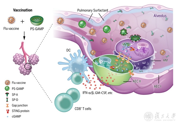 研究团队基于cGAMP设计制备了一种肺部仿生纳米颗粒(PS-GAMP)来模拟流感病毒肺部感染,发现其能够在不破坏肺部表面活性剂(PS)和肺泡上皮屏障(AEC)的情况下,激活AMs和AECs,促进疫苗产生高效的体液和CD8+ T细胞保护性免疫反应,以抵抗多种异型流感病毒的攻击。研究结果提示AECs在产生广泛的交叉保护以抵御各种流感病毒方面具有十分重要的作用,表明PS-GAMP可能是一种“通用”流感疫苗的潜在粘膜佐剂。