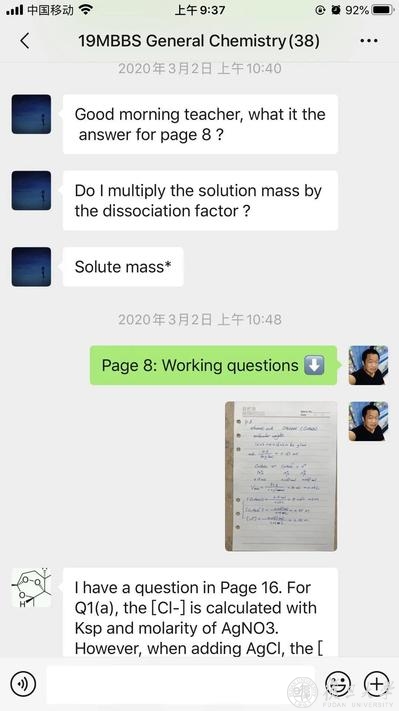 耐心地在纸上把运算过程一步步写下来,关键的地方标示清楚,需要作图时就作图,全部完成后再一张张拍照,插入PPT中需要演算步骤和范例的位置,留学生全英文课程“普通化学A(下)”的任课老师、化学系教授郑耿锋,以此应对线上教学无法实时写板书的不便。课上答疑时间,他也常备纸笔在身边,遇到稍微复杂点的问题,通通写下来拍照发进课程群里。“如果我发语音或文字,聊天记录多了之后,同学们再找起来就很不方便,但图片可以保存下来,以后随时查看。”郑耿锋说:“我也希望通过写下来这个行为,带动同学们落笔写、多练习。”