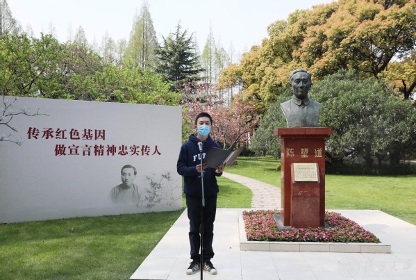 “100年前的4月,陈望道老校长完成了《共产党宣言》的翻译工作,100年后的今天,我们倡议:传承红色基因,做‘宣言精神’忠实传人!”活动中,学生代表发起“传承红色基因,做宣言精神忠实传人”倡议,号召复旦大学全体学生共产党员熟读精思《宣言》,掌握马克思主义真理力量;铭记源头初心,坚定马克思主义崇高信仰;秉持人民立场,练就服务人民的过硬本领;争做时代先锋,续写复旦青年的崭新篇章。师生们表示,要把陈望道老校长翻译宣言的故事代代讲下去,不断重温老校长翻译宣言的壮阔历程,学习老校长的崇高精神,汲取“不忘初心、牢记使命”的力量,在新时代进一步诠释弘扬复旦人“团结、服务、牺牲”的精神,更加自觉地做宣言精神的忠实的传承人。