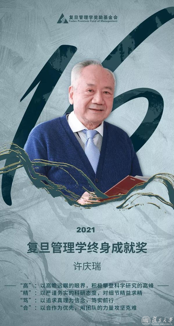 11月26日,2021年复旦管理学论坛暨复旦管理学奖励基金会(以下简称“基金会”)颁奖典礼在上海隆重举行。中国工程院院士、浙江大学管理学院教授许庆瑞获颁“复旦管理学终身成就奖”;哈尔滨工业大学经济与管理学院教授李一军、中国科学院自动化研究所研究员曾大军、天津大学讲席教授张维获颁“复旦管理学杰出贡献奖”;福耀玻璃集团创始人、董事长曹德旺获颁“复旦企业管理杰出贡献奖”。